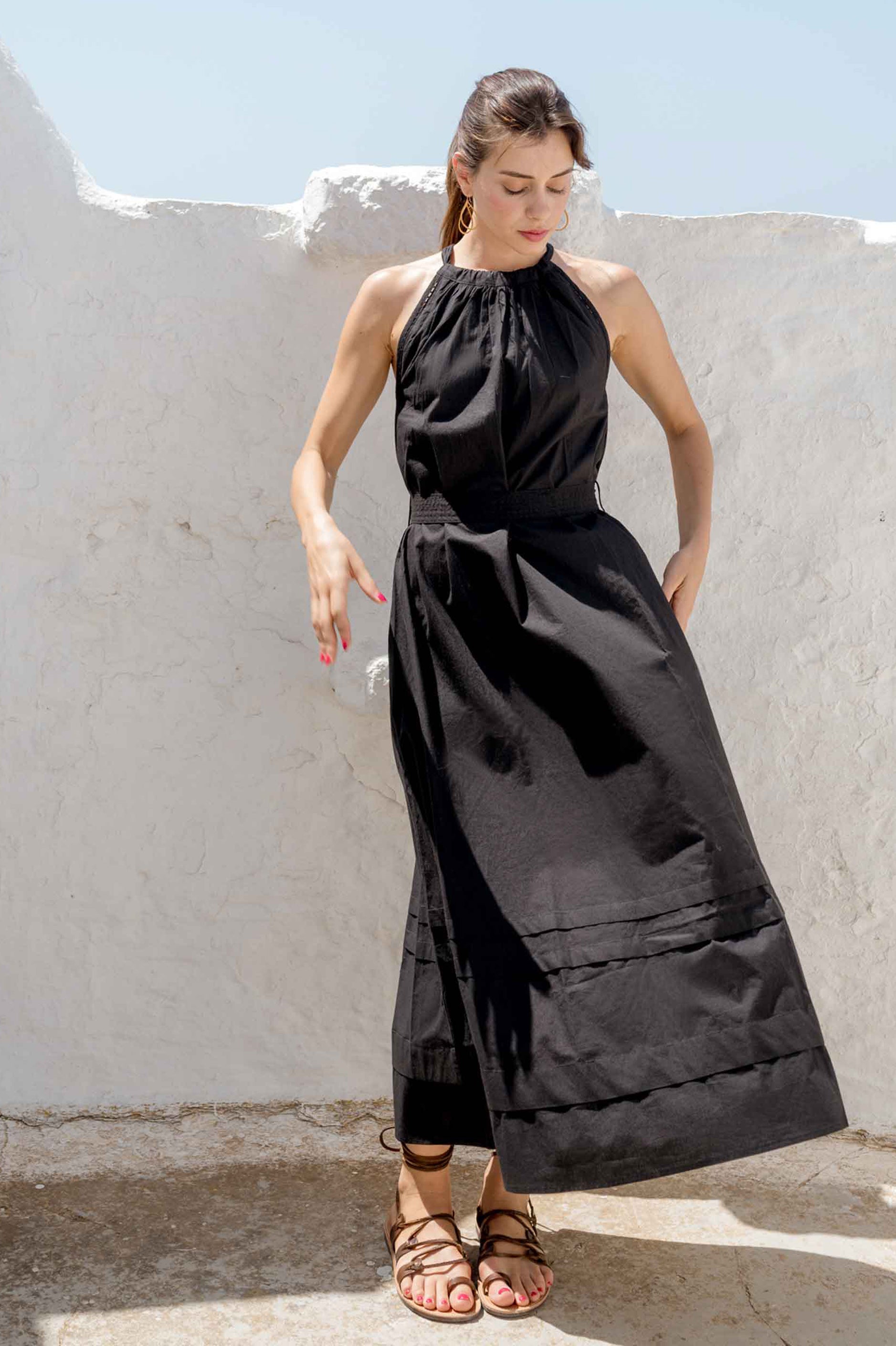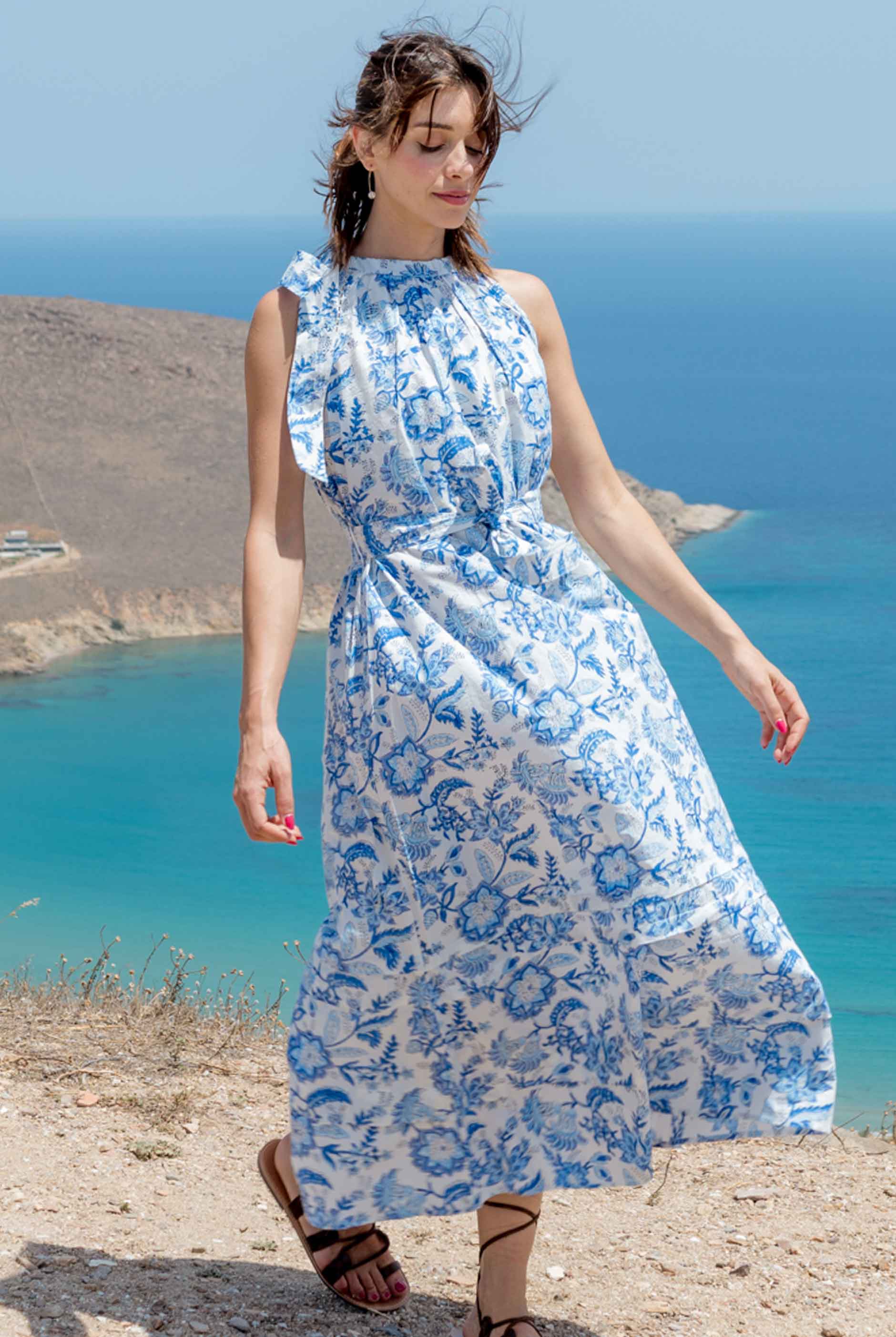 • White Linen Halter Top with Adjustable Ties, allowing for dress to be worn high or low on neck