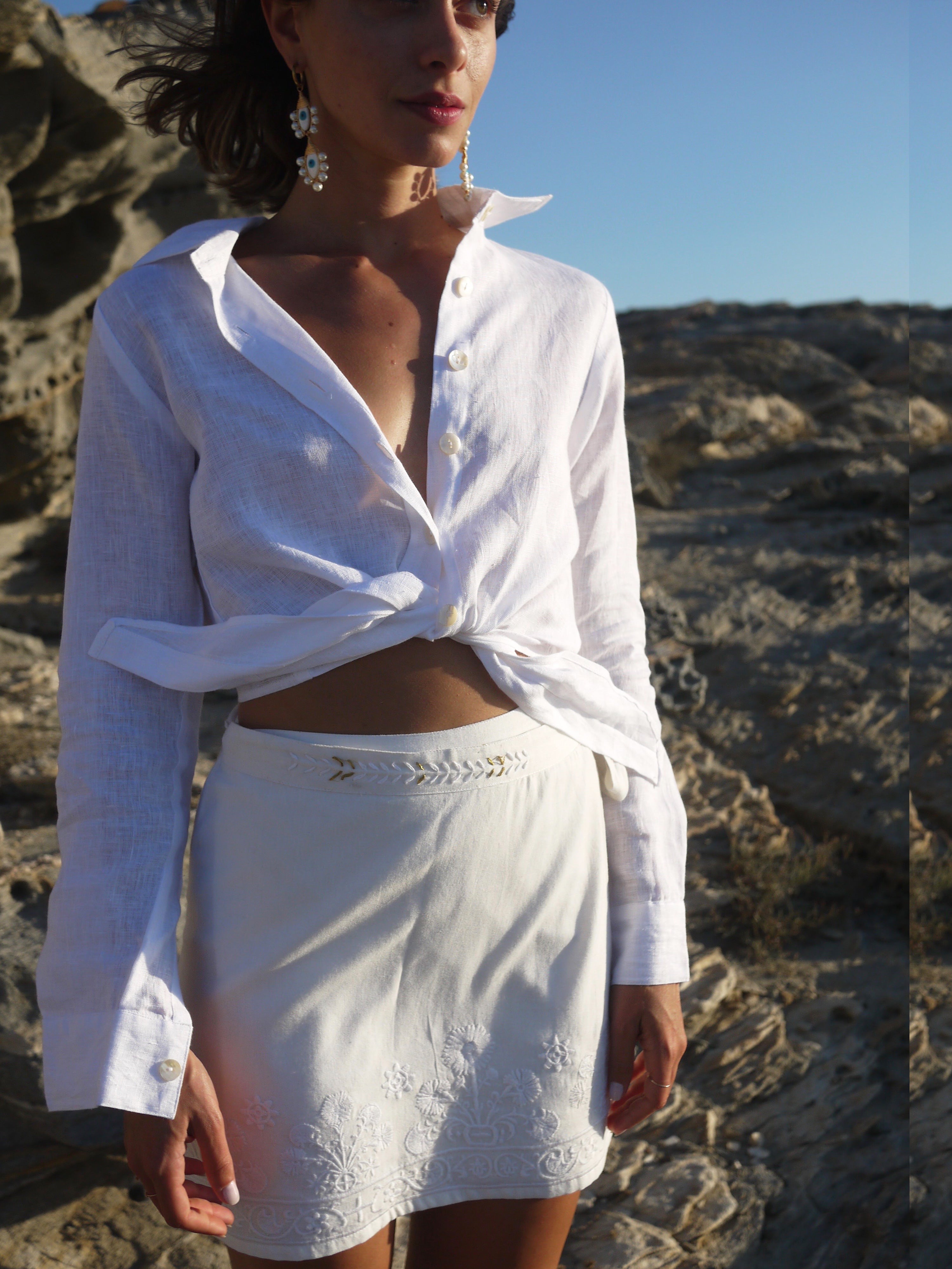Arsenia Aline Embroidered Short Wrap Skirt in Linen - Ivory