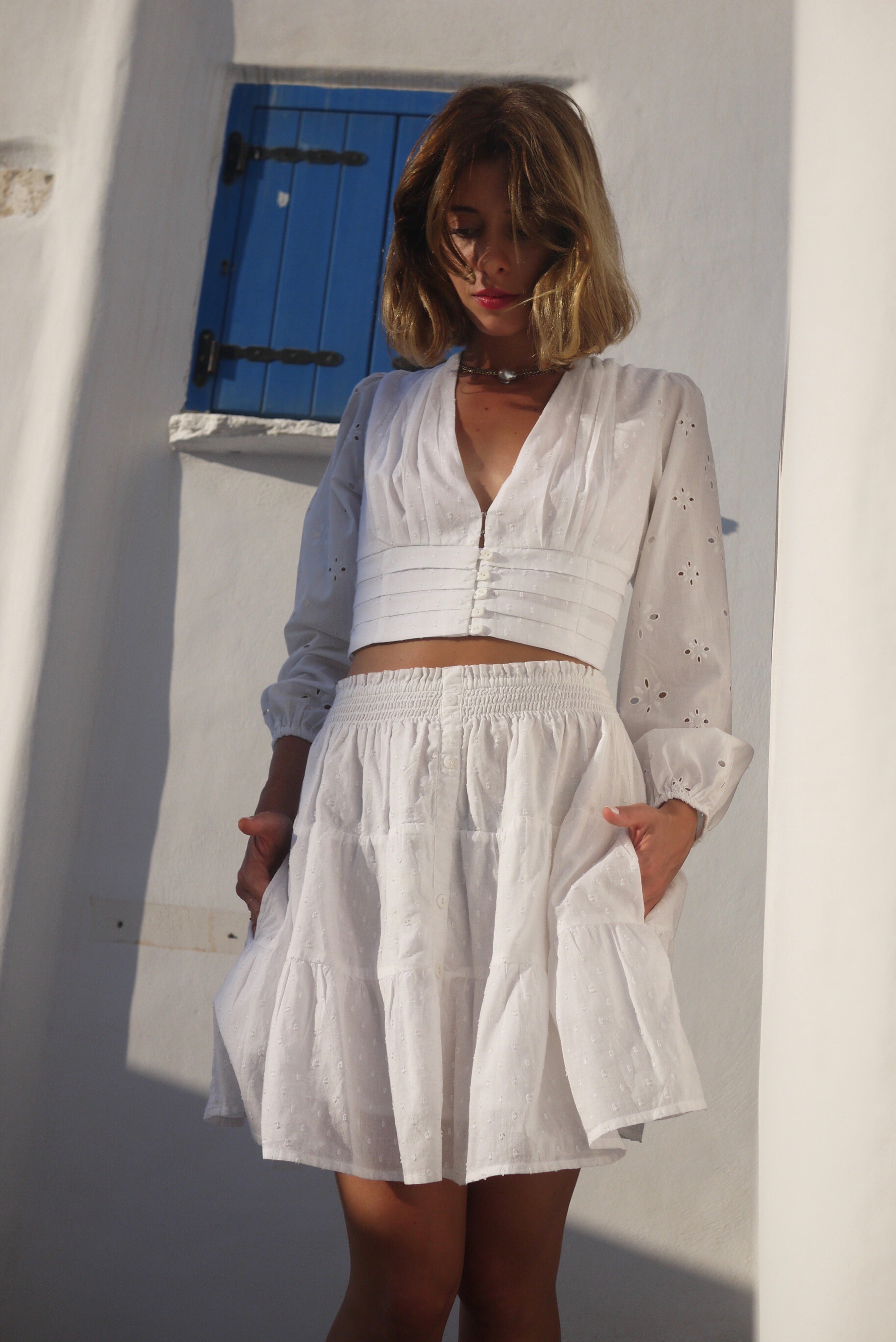 Meet the White Athena Half Top, featuring beautiful ethereal puff sleeves and button down bodice. Made from 100% cotton and elasticated smocked back, she is as comfortable as she is fun. Choose how much skin you want to show, with additional inner eye hooks for less of a plunge look.