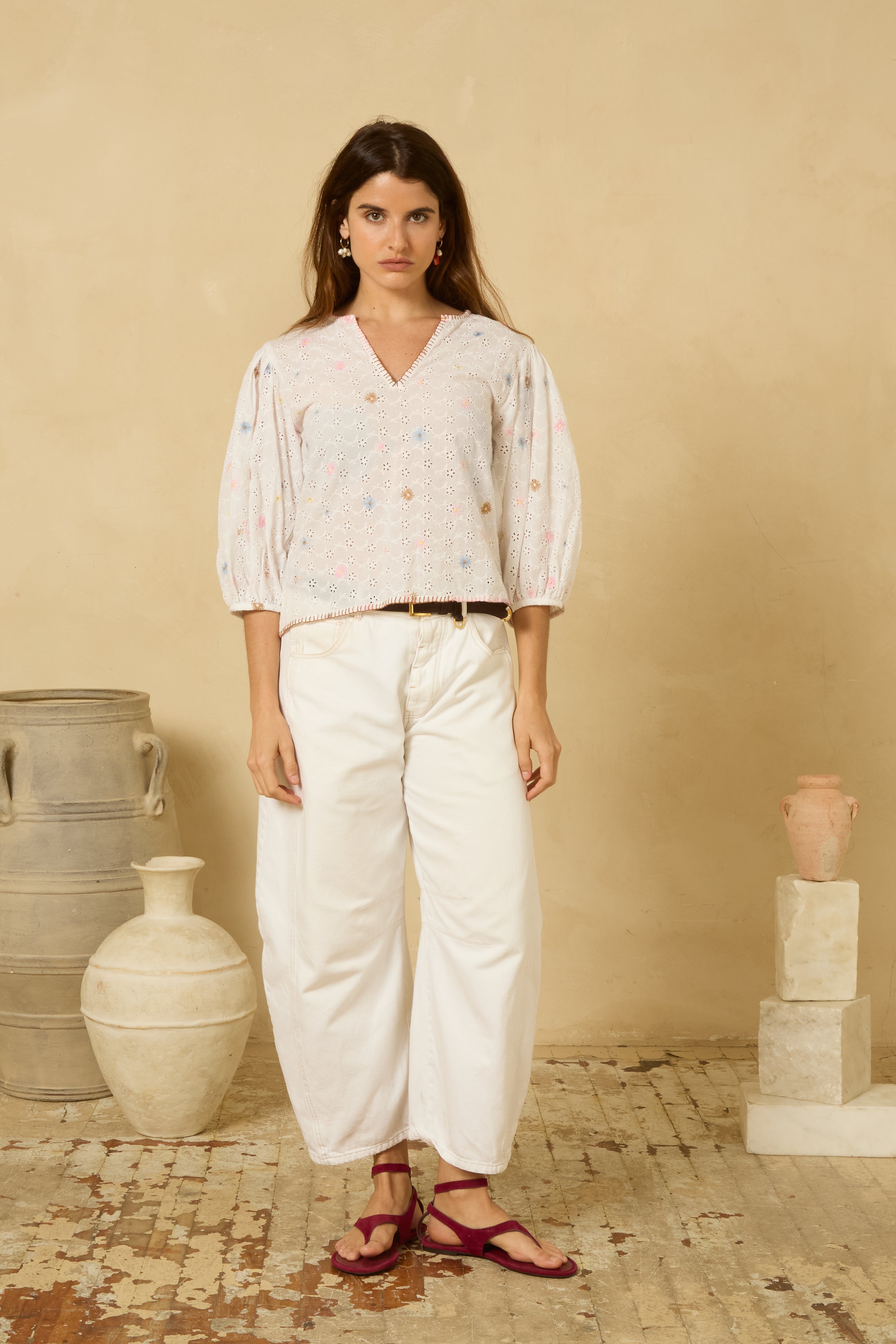 Say hello to Clio. A nostalgic nod to slim silhouettes with broderie anglaise and embroidered flowers. Wear as a stylish kaftan or transition to cocktails with nude undergarments. We love to style with our Shibori Skinny Pareo with Hand Stitching - Watercress.